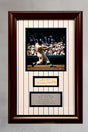 Custom framed in a 2" cherrywood frame. Triple matted in black, blue and pinstripe. Enclosed in conservation clear glass with 99% UV Protection to keep signature from fading. A custom engraved descriptive plaque is added. Dust covered and wired-ready for hanging.