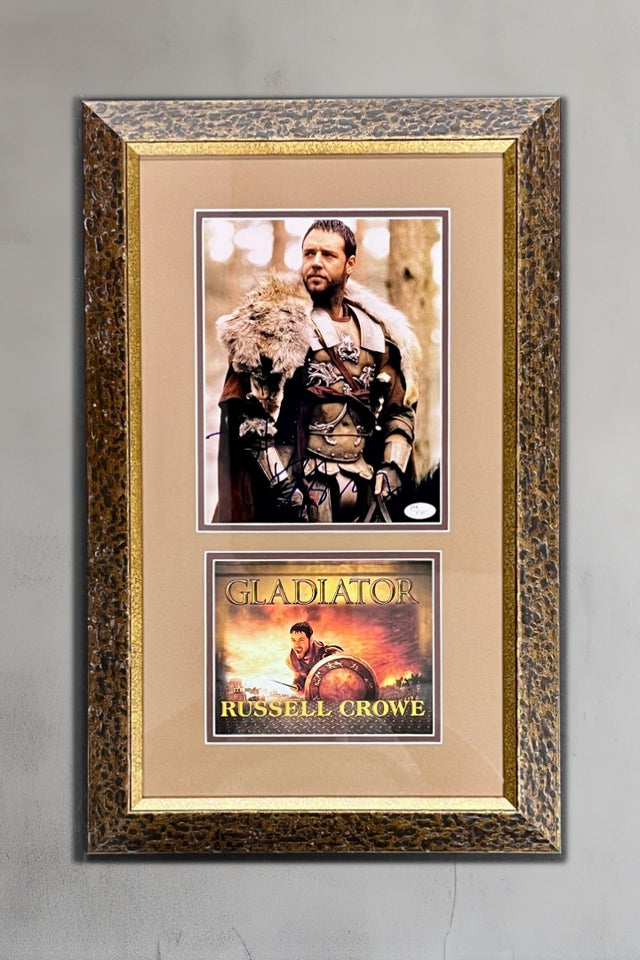 • Signature: The display features an 8x10 photo signed by Russell Crowe in his iconic role as Maximus in Gladiator. The signature is bold, clear, and authenticated, making this a unique and valuable collectible.