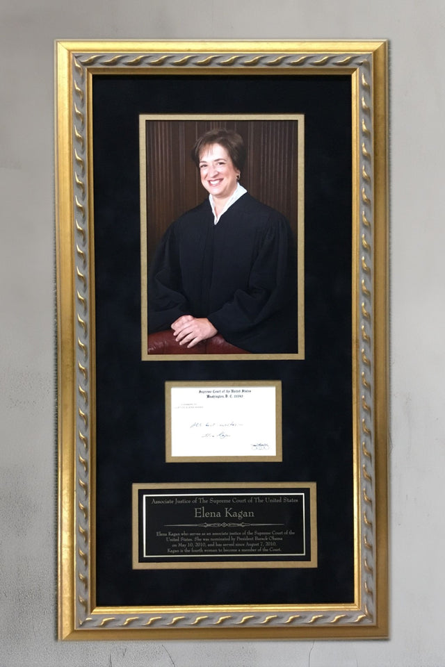 Product Details: Professionally framed display featuring an Office card of Supreme Court Elena Kagan. The signature is authenticated by JSA.