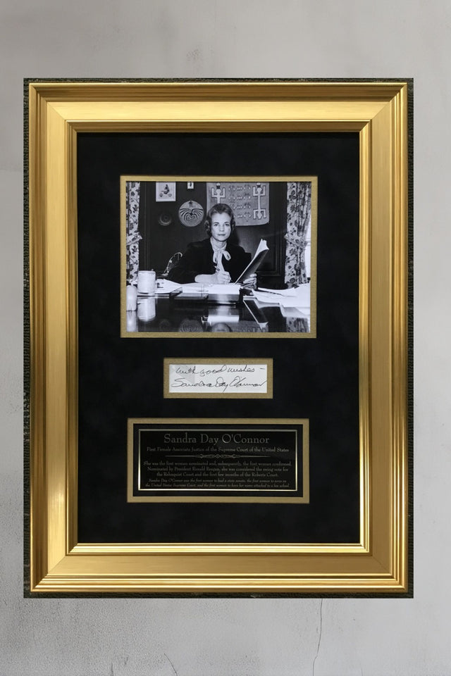 Professionally framed display featuring a cut signature of Supreme Court Justice Sandra Day O'Connor, the first woman appointed to the Supreme Court. The signature is authenticated by JSA.