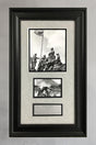 Custom Framed in a 2 1/2" black frame, triple matted with gray linen outer mat and silver and black inner mat. Matted into the display is a engraved description plaque. Enclosed in 99% UV museum glass to prevent the signature and document from fading.