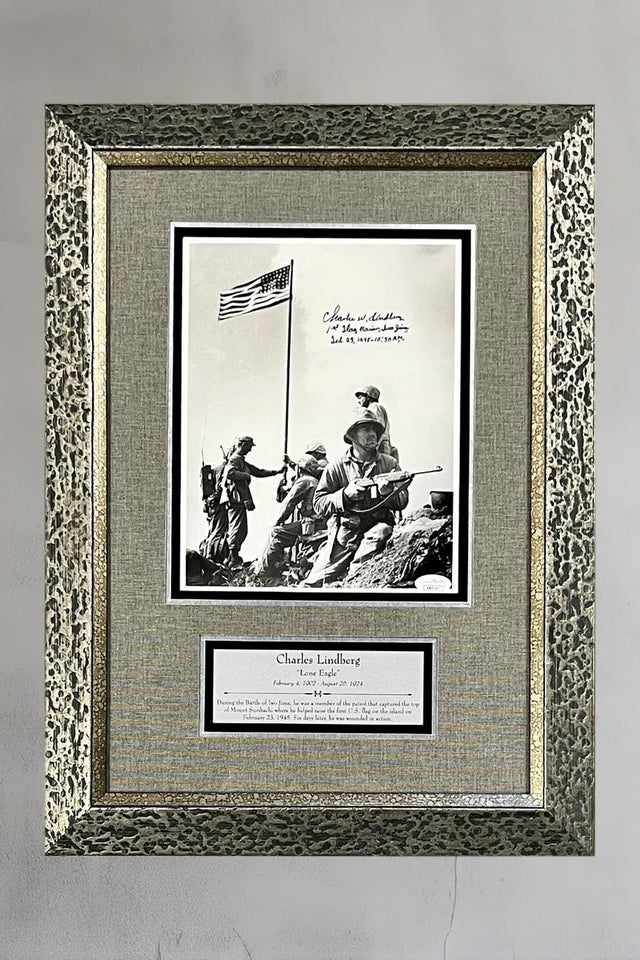Black and white 8x10 photo signed by original Iwo Jima Flag Raiser Charles W. Lindberg d.2007. Lindberg was part of a group of Marines who hoisted the first flag during combat on Mount Surabachi, Iwo Jima. Lindberg has signed and added the inscription ""1st Flag Raiser, Iwo Jima. Feb 23, 1945 10:30 am. to this photo. The photo is authenticated by JSA.