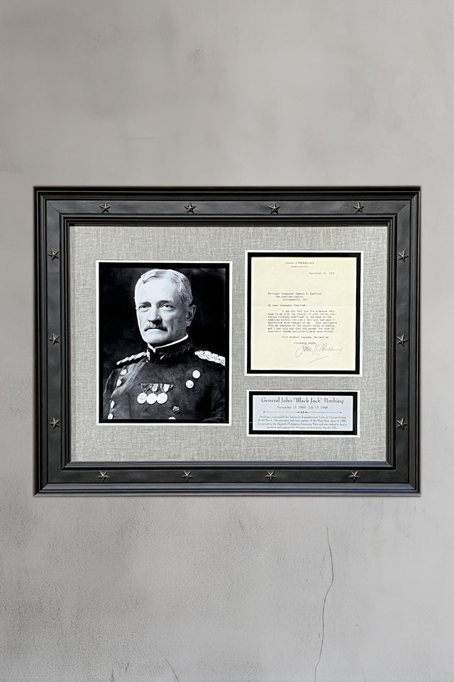This exquisite piece features a signed letter from General John "Blackjack" Pershing, a well-respected and iconic figure in American military history. The letter is elegantly framed in a 2 1/2 inch nickel wood frame with black outer features, measuring 11 x 14 inches. This sophisticated framing not only protects the letter but also enhances its presentation, making it a striking addition to any collection.