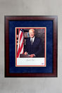 Custom Framed in a 1" high quality cherry wood frame. Triple matted in red, gold and blue suede. Enclosed in conservation clear glass 99% UV protection to keep the signature from fading. Dust covered backed, wired ready for hanging in your den, office or man cave.