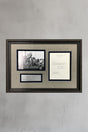 Custom Framed in a 1" black ornate frame, triple matted with gray linen outer mat and blue & black suede inner mat. Enclosed in 99% UV museum glass to prevent the signature and document from fading. Dust covered backed, wired ready for hanging