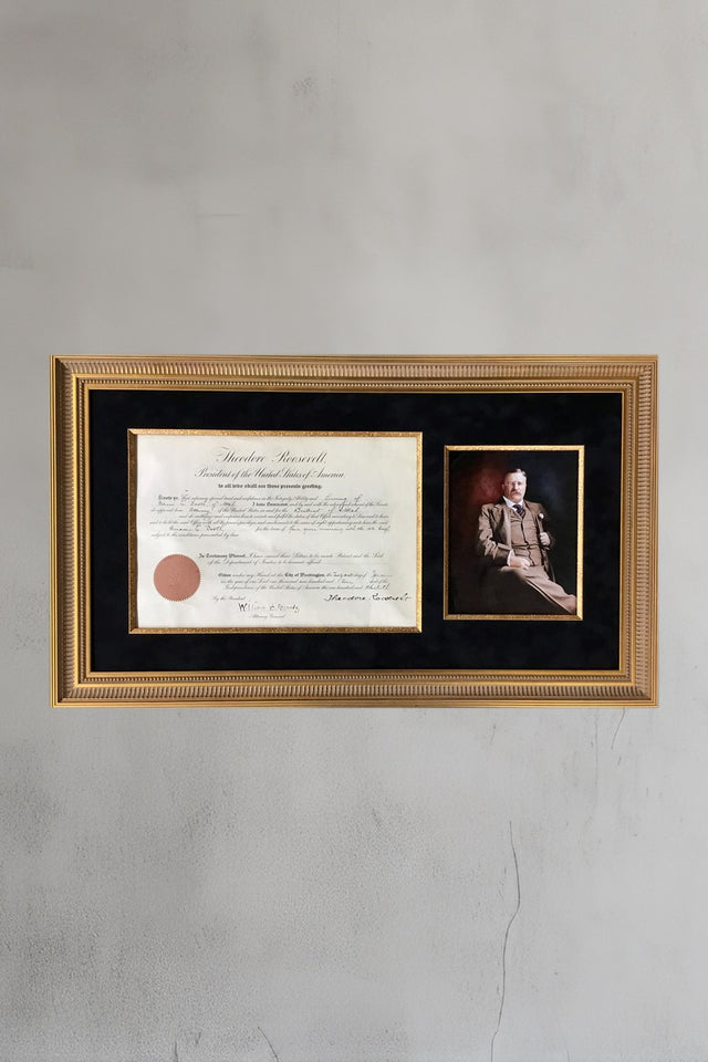 Custom Framed in a 2" gold ribbed wood frame, matted with black suede and gold wood fillet. Matted into the display is a photograph of Roosevelt and a engraved description plaque. Enclosed in 99% UV museum glass to prevent the signature and document from fading.