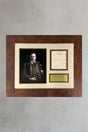Custom Framed in a 3" wlanut burl frame, triple matted with rattan linen outer mat and gold & brown suede inner mat. Matted into the display is a photograph of Roosevelt and a engraved description plaque. Enclosed in 99% UV museum glass to prevent the signature and document from fading.