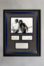 Custom framed in 2 inch decorative black frame with blue inlay frame. Triple matted in black, blue, and grey linen. A custom engraved descriptive plaque is included. Enclosed in 99% UV museum glass to protect the signature from fading