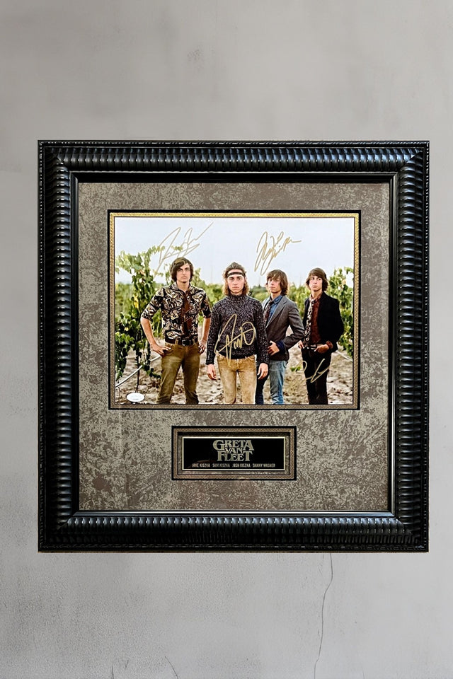Product Details: Professionally framed display featuring an 11x14 signed by all 4 members of the rock group Greta Van Fleet. Photo is signed by Jake Kiska, Sam Kiska, Josh Kiska and Danny Wagner. Incredible hard to get all 4 on an item. The signature is authenticated by JSA #AQ65458.