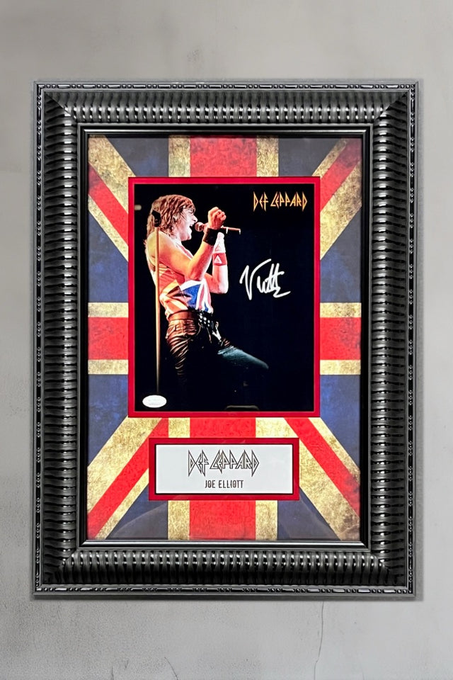 This custom-framed display featuring an autographed 8x10 photo of Joe Elliott, the legendary frontman of Def Leppard, is a must-have for any music fan or collector of rock memorabilia. Here's a closer look at the details: