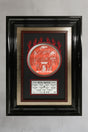 Custom Framed in 3 Frames: 1" cherry shadowbox floated on a 2" silver bubble frame, capped with a 4" gloss black frame, double matted with black linen outer mat and red suede inner matting. Custom cut flame mat to enhance the drumhead. Enclosed in conservation clear glass 99% UV protection to keep the signature & art from fading. Dust covered backed, wired ready for hanging.
