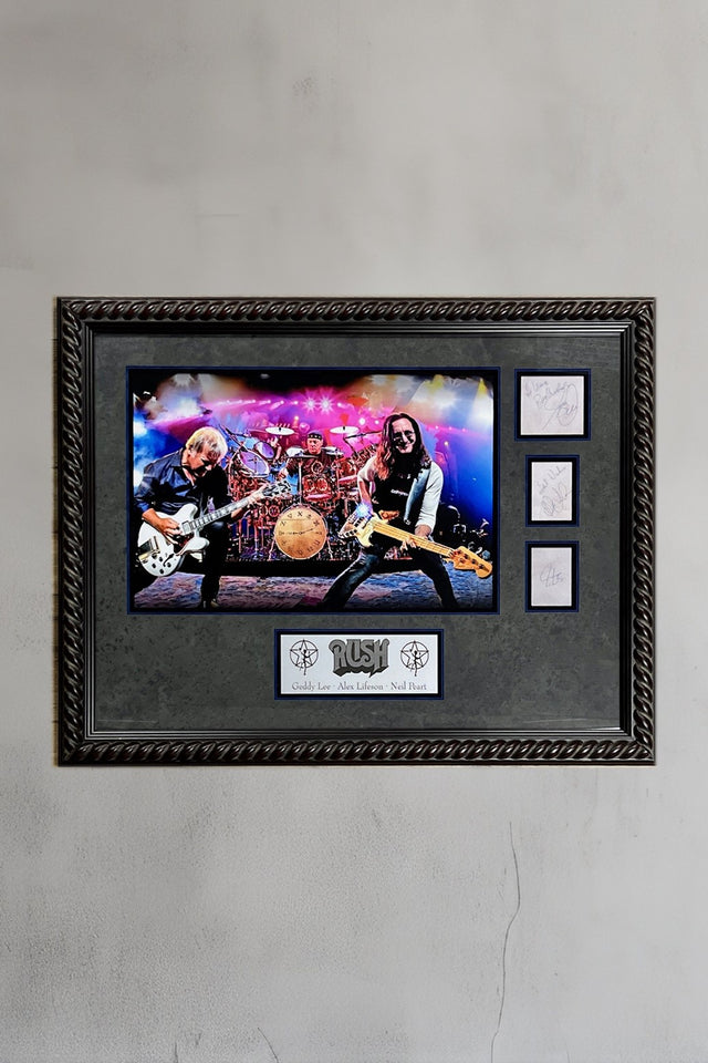 Featuring 3 cut signatures of the original members of the rock group RUSH. Signatures include Getty Lee, Alan Lifson and Neil Peart. Extremely hard to get especially Peart.
