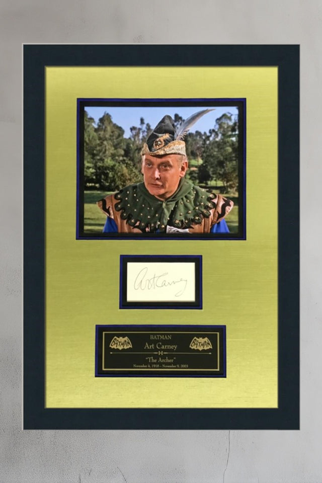 Professionally framed display featuring a cut signature from actor Art Carney, in his his role as The Archer from the hit t.v. show Batman. The signature is authenticated by JSA. The JSA sticker is on reverse of card.