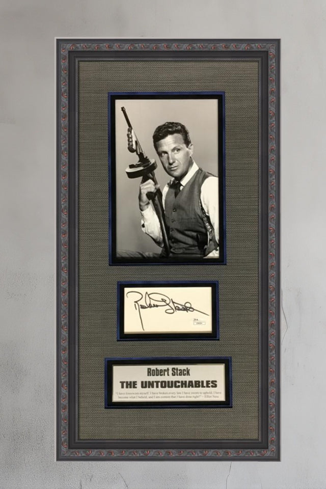 Professionally framed display featuring a cut signed by actor Robert Stack, best known for his role as Elliot Ness in the hit tv series The Untouchables. The signature is authenticated by JSA.