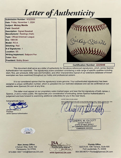 Mickey Mantle signed A.L. Baseball-JSA ZZ25048
