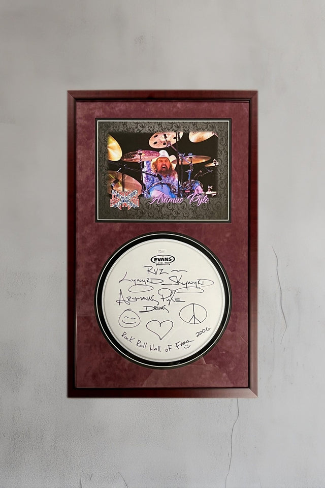 Featuring a 12" drum head signed perfectly by drummer of the iconic southern rock band Lynryd Skynyrd, Artimus Pyle. Artimus has added many inscriptions and drawings to this awesome drum head. The head is authenticated by JSA
