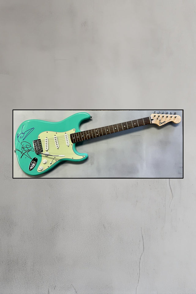Beautiful Aqua Fender Squire Stratocaster guitar signed perfectly by original Queen band members Brian May and Roger Taylor.